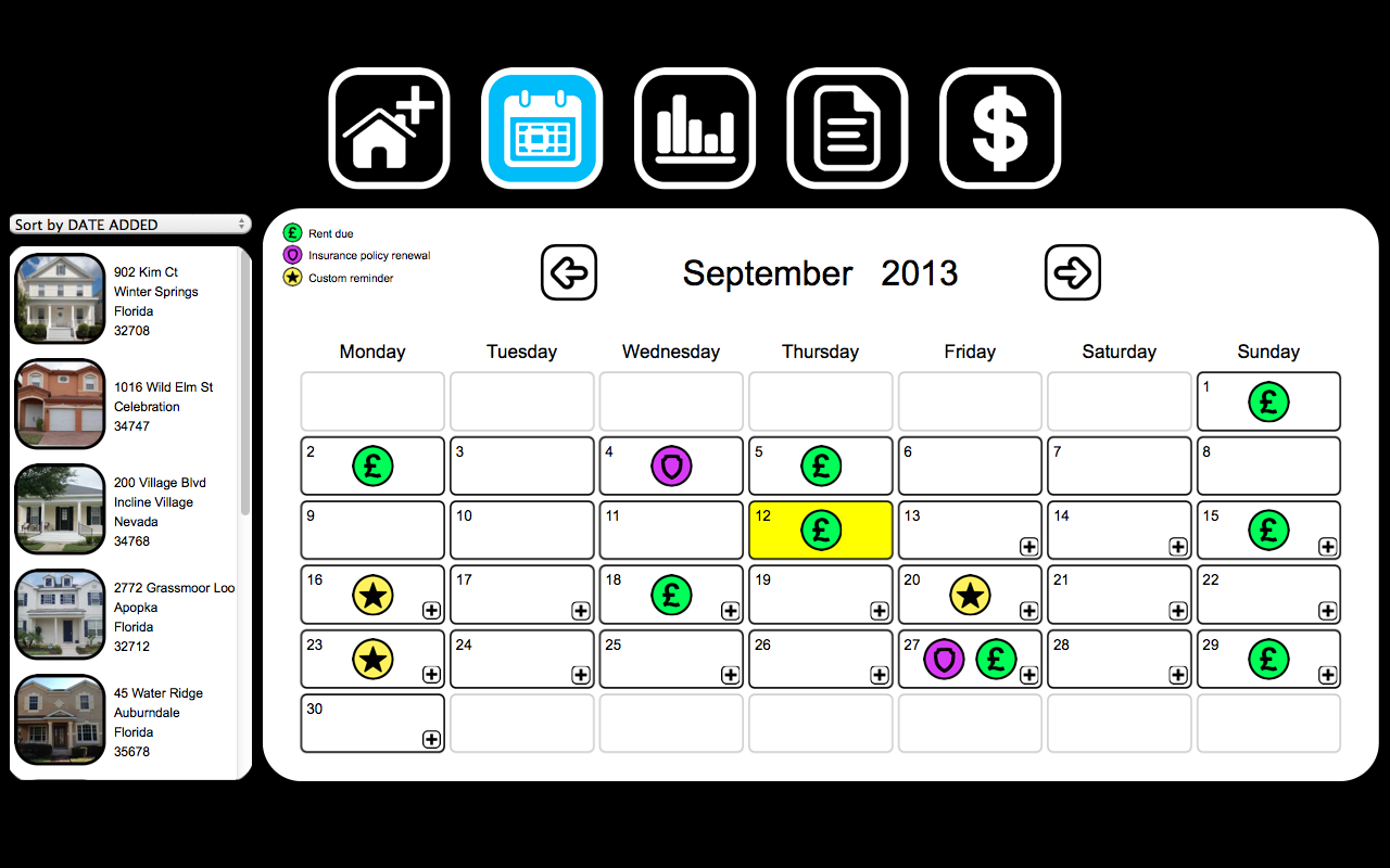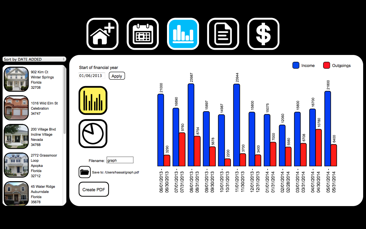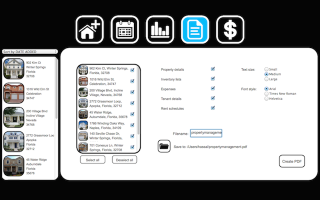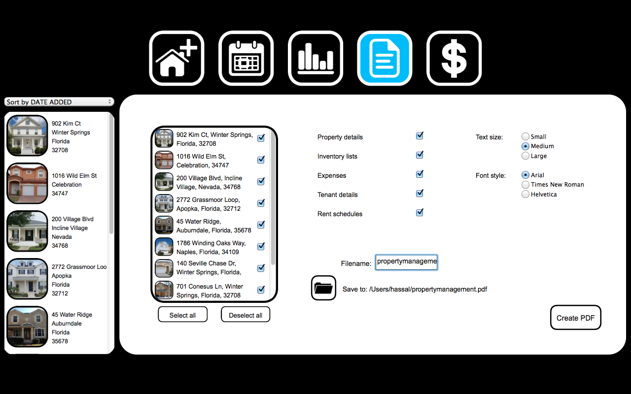 • Generate pdf documents containing information on your properties such as rent schedules, inventory lists, tenant information, etc that can then be saved and printed.